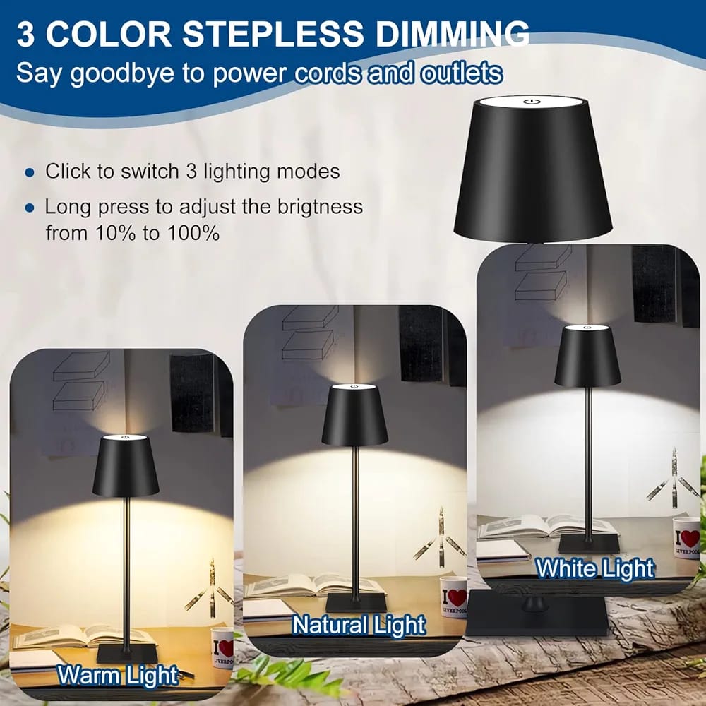 💡【إضاءة قابلة للتعتيم بـ3 ألوان】يتميز مصباح الطاولة اللاسلكي من زوبين بثلاث ألوان درجات حرارة ووظيفة تعديل مستوى السطوع. حيث يمكن التبديل بين الألوان الثلاثة (ضوء دافئ / ضوء طبيعي / ضوء أبيض) بلمسة على الجزء العلوي. كما يمكن الضغط المطول على الجزء العلوي لتعديل السطوع بشكل تدريجي لا نهائي: بنطاق سطوع من 5% حتى 100%. مما يتيح لك التحكم بسهولة في الإضاءة لدمج الأناقة العصرية مع الطابع الفريد وصنع أجواء ليلية رومانسية.